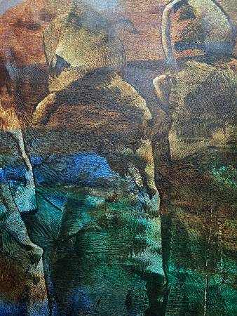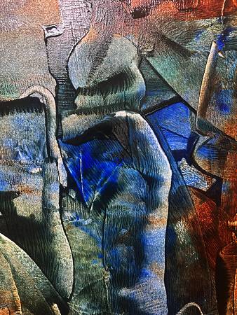 And yet to my eye the most adventurous of the newer canvases in the show, still owes something to the lexicon of the earlier work, though here it seems Sahni’s method has turned to a new and pronounced improvisation. Visthapan’s surface remains in a perturbed state. Edges are ragged and makeshift. Translucency dominates. There is even a gestural coarseness replacing what was once a controlled chaos of endlessly suggestive shapes. The color alone in Visthapan provides the link to earlier work, being mostly middle tones of contingent primary and secondary hues.